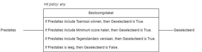 Any | De beslissingstabel bevat meerdere regels die allemaal tot hetzelfde resultaat leiden. Als een van de regels overeenkomt, wordt het resultaat getriggerd. Opgelet: als niet alle resultaten hetzelfde zijn, zal de process engine een fout opwerpen. | Olympische Spelen | Een sporter wordt geselecteerd voor de Olympische Spelen in één van de volgende scenario's: een toernooi winnen, een minimumscore overtreffen, beter presteren dan concurrenten. |