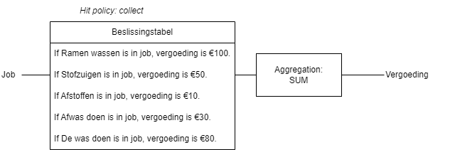 Collect | De beslissingstabel bevat meerdere regels. Elke regel wordt geëvalueerd. Voor elke overeenkomst wordt de resulterende optie opgenomen in de uitkomst. Binnen de uitkomst worden de resultaten willekeurig opgesomd en kunnen worden samengevoegd. Aggregatiemogelijkheden zijn SUM, MIN, MAX, COUNT. Opmerking: als de Collect hit policy wordt gebruikt met een aggregator, kan de beslissingstabel slechts één output kolom hebben. | Berekening vergoeding | Nadat een aannemer een taak heeft afgerond, wordt het totale honorarium berekend op basis van de taken die hij heeft uitgevoerd. Voor elke taak wordt een vast honorarium bepaald. Elke regel controleert of de aannemer een bepaalde taak heeft uitgevoerd. De resultaten worden samengeteld (SUM) binnen de uitkomst. |