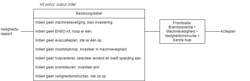 Output order | De beslissingstabel bevat meerdere regels. Elke regel wordt geëvalueerd. De geselecteerde opties worden in volgorde van prioriteit weergegeven. Niet ondersteund door de process engine! | Risicoanalyse | Bij een risicoanalyse wordt een lijst met risico's gecontroleerd. Voor elke match moet een specifieke preventieve maatregel worden uitgevoerd. In het resultaat worden de maatregelen in volgorde van prioriteit weergegeven. |