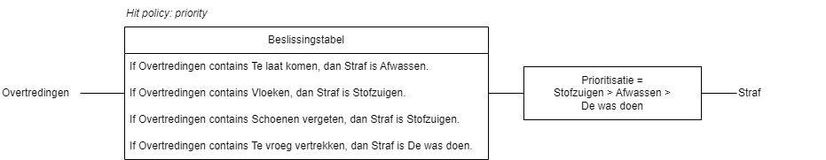 Priority | De beslissingstabel bevat meerdere regels. Elke regel wordt geëvalueerd. Alleen de optie met de hoogste prioriteit wordt geselecteerd. Niet ondersteund door de process engine! | Strafbepaling | Een persoon is verantwoordelijk voor meerdere overtredingen. Elke regel controleert een overtreding en geeft een specifieke straf. Het resultaat is een lijst met straffen. Maar alleen de straf met de hoogste prioriteit wordt geselecteerd. |