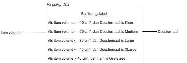 Voor een bepaald item volume kunnen meerdere doosformaten worden gebruikt, maar alleen de eerst passende wordt geselecteerd (de regel met de hoogste notering krijgt voorrang). Dit zorgt ervoor dat elk item in een doos van het juiste formaat wordt gestopt (en niet in een onnodig grote doos). Op het einde is er een fallback regel voorzien die het item markeert als oversized. Het item past dan in geen enkel doosformaat.