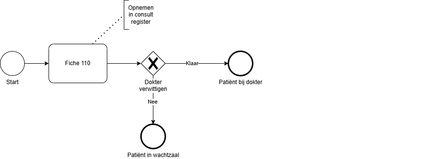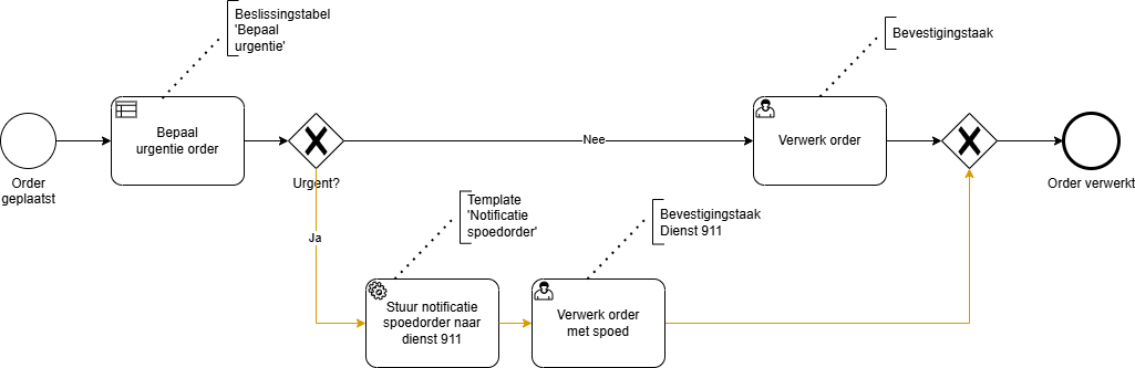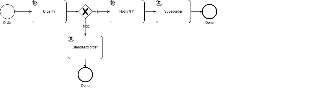 Exclusive gateways duid je best aan via een vraag zoals ‘Goedgekeurd?’ of ‘Meerderjarig?' met dan het antwoord ‘Ja’ of ‘Nee’ gedefinieerd op de uitgaande flows.