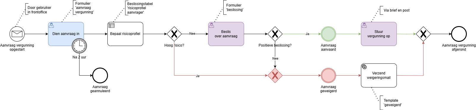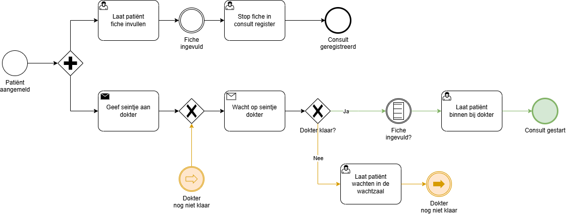 Denk aan het groen kleuren van alle pijlen in de happy flow en het rood kleuren van pijlen in flows waar je problemen, errors of uitzonderingen behandelt.