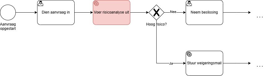 In onderstaand voorbeeld voeren we de risicoanalyse uit via een service taak die een stuk code oproept. De regels om het risicoprofiel te bepalen zijn niet zichtbaar.