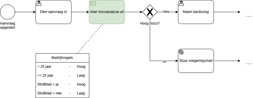 Zelfde proces, maar we voeren de risicoanalyse nu uit via een business rule taak. De gekoppelde bedrijfsregels worden geëxpliciteerd via een beslissingstabel. Dit maakt het veel leesbaarder voor een business owner.