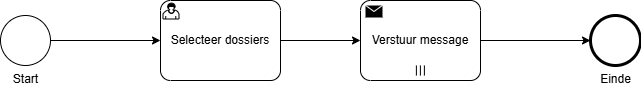 We hebben nu een message die uitgestuurd wordt naar elk van de geselecteerde dossiers. De key van deze message is stopTaakDoorBulk. Het komt er nu op aan om deze message te gebruiken om de gewenste bevestigingstaak in het hoofdproces af te ronden. Zie daarvoor de pagina Bulktaak integreren in hoofdproces.