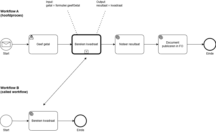 Hieronder vind je een eenvoudig voorbeeld van hoe een called workflow werkt. In workflow A (hoofdproces) is een call activity ‘bereken kwadraat’ opgenomen. Deze roept workflow B (called workflow) aan waar dan de effectieve berekening van het kwadraat uitgevoerd wordt. Workflow B spitst zich dus toe op één enkele functie en kan daarom potentieel opgeroepen worden vanuit meerdere hoofdprocessen. De interface tussen workflow A en workflow B kan je instellen via de input mapping en de output mapping. Zo kan je het input getal doorgeven en het resultaat terugnemen.