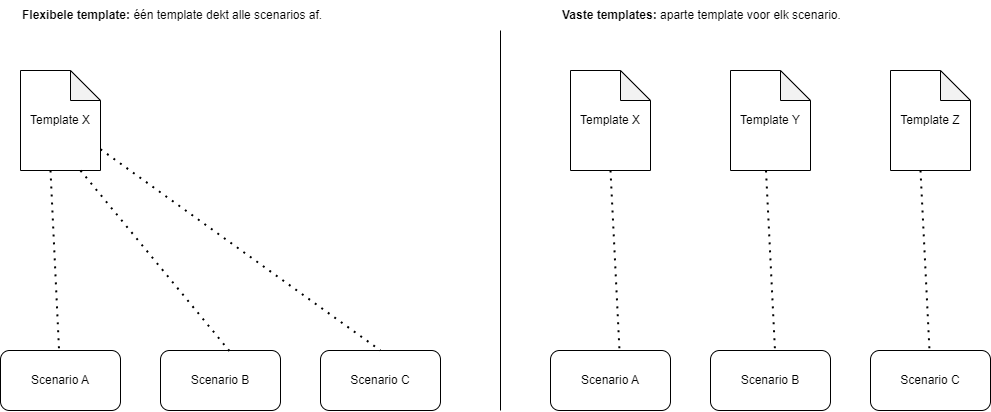 Maak gebruik van hulpfuncties zoals if , ifCond , latestMilestone of latestTask om logica en dynamische inhoud aan je template toe te voegen. Hierdoor kun je een flexibele template configureren die een groot aantal scenario's afdekt, in plaats van dat je verschillende vaste templates moet bouwen en onderhouden om elk mogelijk scenario af te dekken. Andere hulpelementen zoals {{dossier.label}} en formuliervelden voegen dossierinformatie toe aan de communicatie. Merk op dat al deze elementen met elkaar gecombineerd kunnen worden (je kan ze bijvoorbeeld nesten).