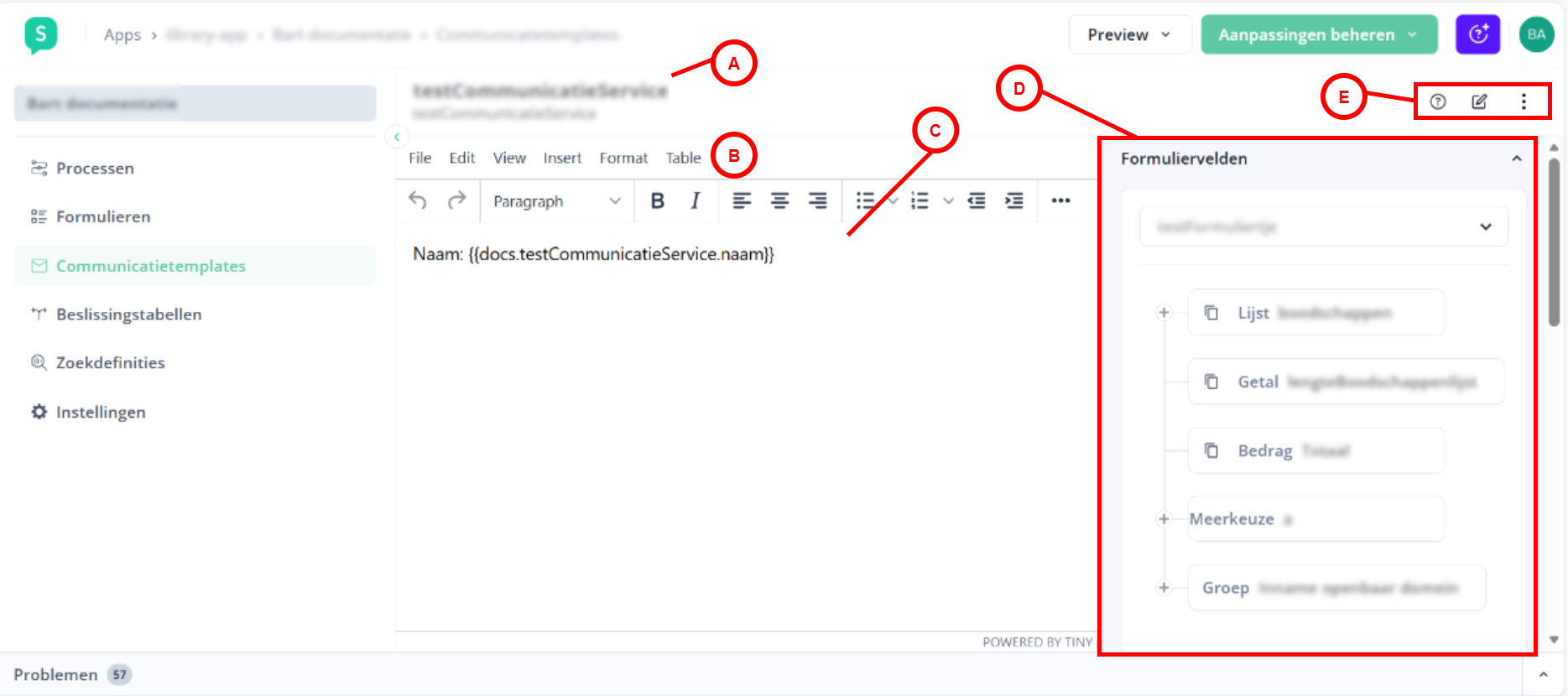 A | Titel communicatietemplate in de screen header | Naam van de template die je aan het bewerken bent. |