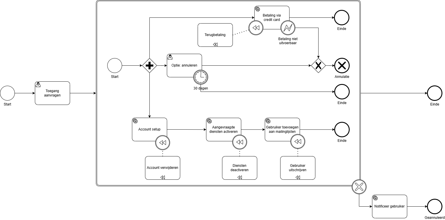Cancel scenario : indien de betaling niet lukt of de gebruiker annuleert binnen de 30 dagen, worden alle stappen automatisch teruggedraaid in omgekeerde volgorde. De laatst voltooide activiteit wordt als eerste gecompenseerd, enzovoort. Er is geen menselijke tussenkomst nodig.