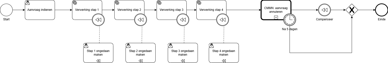 Onderstaand voorbeeld schetst een generiek aanvraag- en verwerkingsproces. Na het indienen van de aanvraag volgen een aantal niet nader omschreven verwerkingsstappen. Tijdens en tot vijf dagen na de verwerking kan de aanvrager beslissen om zijn aanvraag te annuleren. In dat geval moet een dossierbehandelaar manueel de reeds uitgevoerde verwerkingsstappen ongedaan maken. Via de compensation boundary events wordt voor elk van die acties een gebruikerstaak (met bijvoorbeeld een eenvoudige bevestigingstaak) aangemaakt.