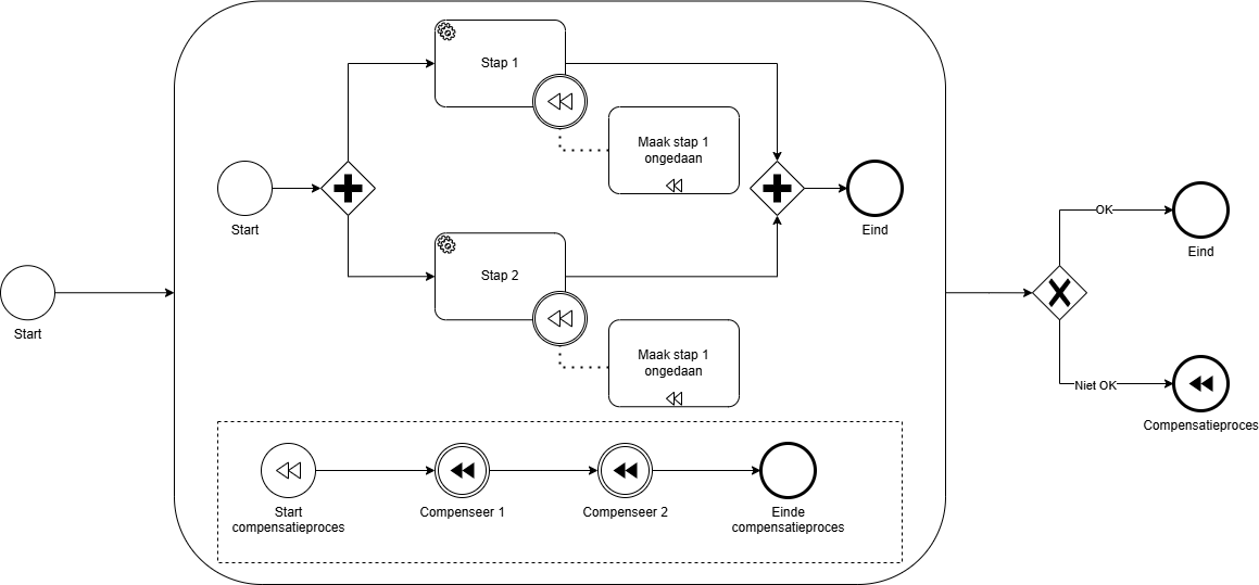 Onderstaand voorbeeld schetst een generieke procedure met simultane uitvoering van twee stappen. Na afloop volgt er een check. Indien alles OK is dan sluit het proces zichzelf af. Is er iets niet OK, dan start het compensatieproces waarbij achtereenvolgens stap 1 en stap 2 gecompenseerd (ongedaan gemaakt) worden.