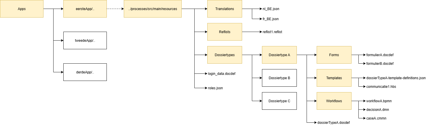 Hieronder zie je een schetsmatige voorstelling van de configuratie-items structuur. De meeste van deze configuratie-items of artefacts kan je aanmaken en bewerken via Studio. Voor developers die op hun pc een lokale app willen opzetten, is het belangrijk om deze structuur te handhaven.