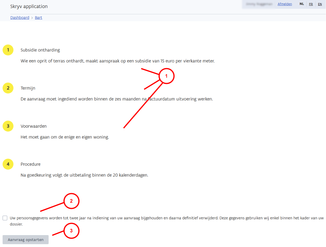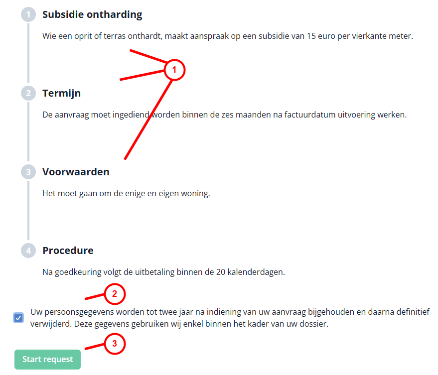 De dossierinformatie pagina is een tussenliggende pagina die gevisualiseerd wordt nadat een gebruiker de gewenste dienstverlening heeft geselecteerd, maar voordat hij of zij daadwerkelijk een aanvraag opstart. Op de dossierpagina vindt de gebruiker een gedailleerde uitleg over de dienstverlening (doel, termijnen, voorwaarden, vereiste bewijsstukken, enzovoort), een GDPR-bericht (met checkbox voor het geven van expliciete consent) en een knop onderaan om de aanvraag effectief op te starten.
