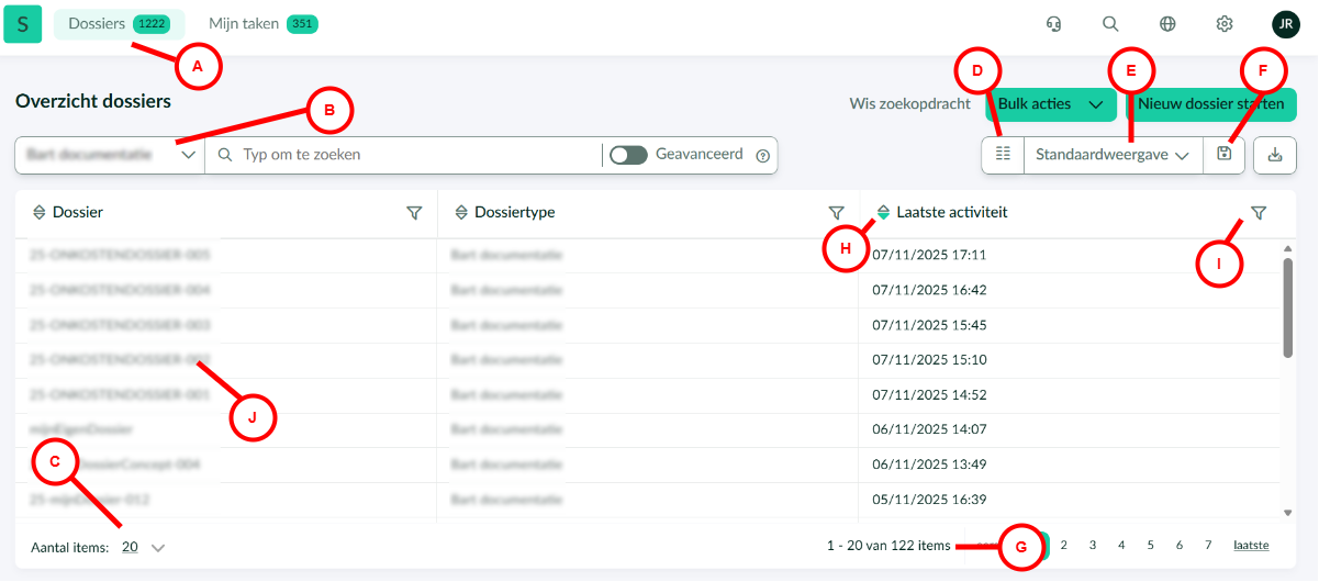 Onderstaand geannoteerd screenshot biedt een inkijk in de onderdelen en mogelijkheden van de dossierlijst.