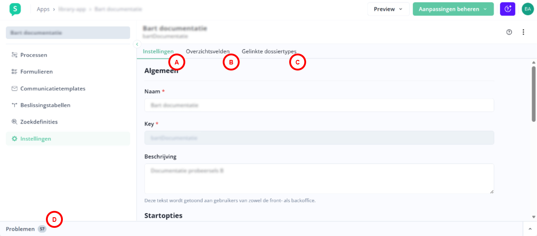 A | Tabblad Algemeen | Configureer algemene dossiertype instellingen zoals naam, key, dossierbeschrijving, dossierlabelformaat en dossierstartknop in frontoffice. |