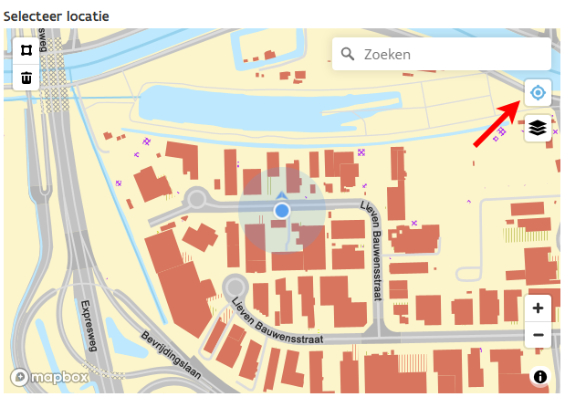 Screenshot met gebruik huidige locatie icoon aangeduid (zie rode pijl).