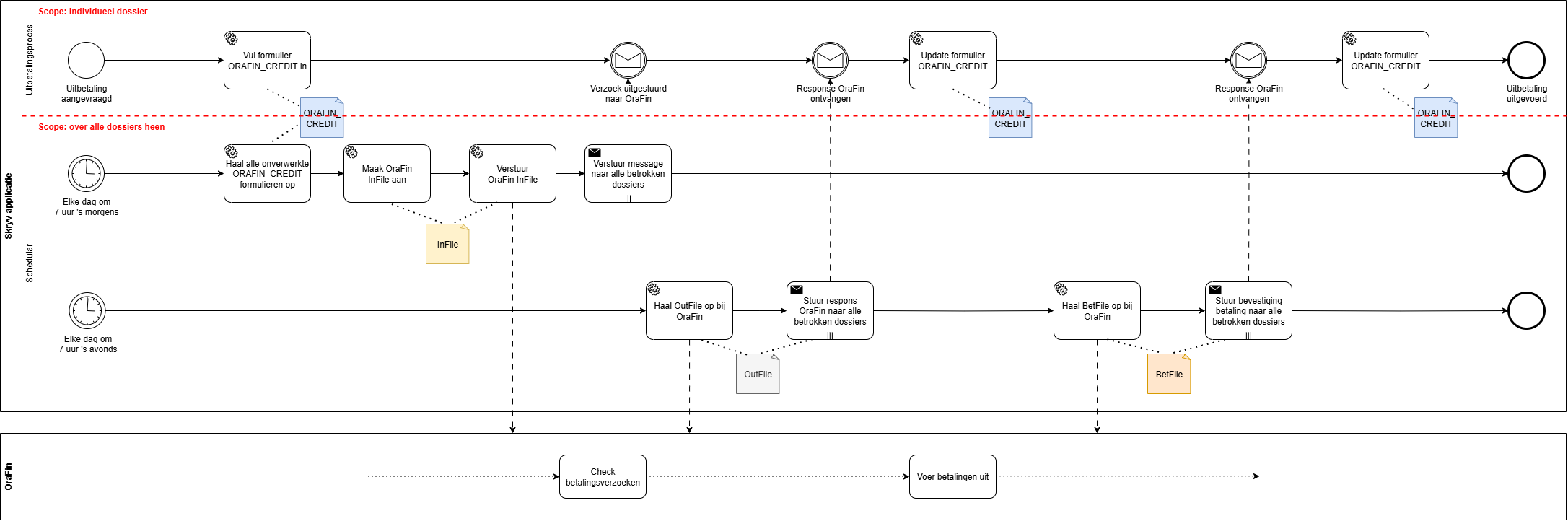 orafin_credit’ (bij betalingen) of ‘orafin_debit’ (bij terugvorderingen). Meer info verderop.Schedular waarbij de applicatie op met OraFin afgesproken tijdstippen bestanden op de Orafin-server plaatst of ophaalt. Bijvoorbeeld, de applicatie bundelt elke morgen om 7 uur alle aangevraagde betalingen en plaatst hiervoor een InFile-bestand op de OraFin-server. Elke avond om 7 uur checkt de applicatie dan weer of OraFin OutFile-bestanden of BetFile-bestanden heeft klaargezet.