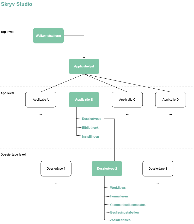 Dit diagram toont de navigatiestructuur voor Studio. De rondleiding neemt je mee doorheen de groen gemarkeerde elementen.