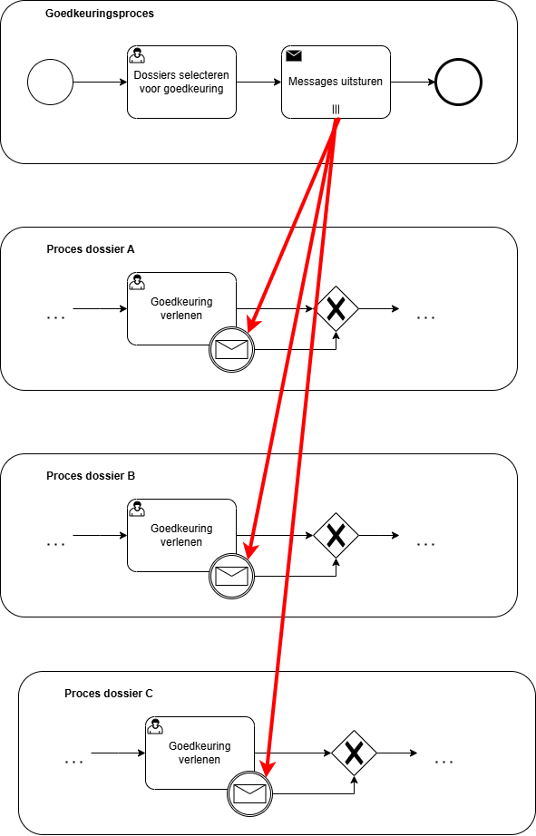 Het voorbeeld toont duidelijk hoe beide processen onafhankelijk van elkaar bestaan (ontkoppeld), waardoor ze elk hun eigen tempo en timing volgen (asynchroon). Dit biedt veel meer flexibiliteit dan dat alles in één proces gedefinieerd zit.