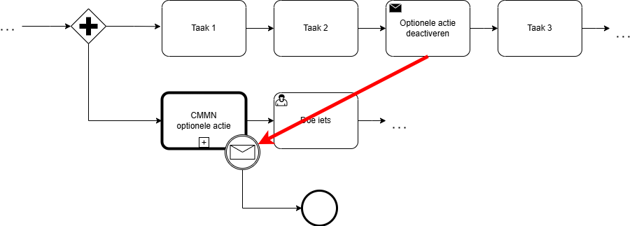 In dit voorbeeld is er via CMMN een optionele actie gedefinieerd binnen het proces. Deze actie mag slechts tijdelijk beschikbaar zijn voor de gebruiker. Van zodra het proces een bepaald stadium bereikt, wordt de optionele actie afgesloten en verwijderd. Ook hier verloopt dit via een bericht dat uitgestuurd en opgevangen wordt.