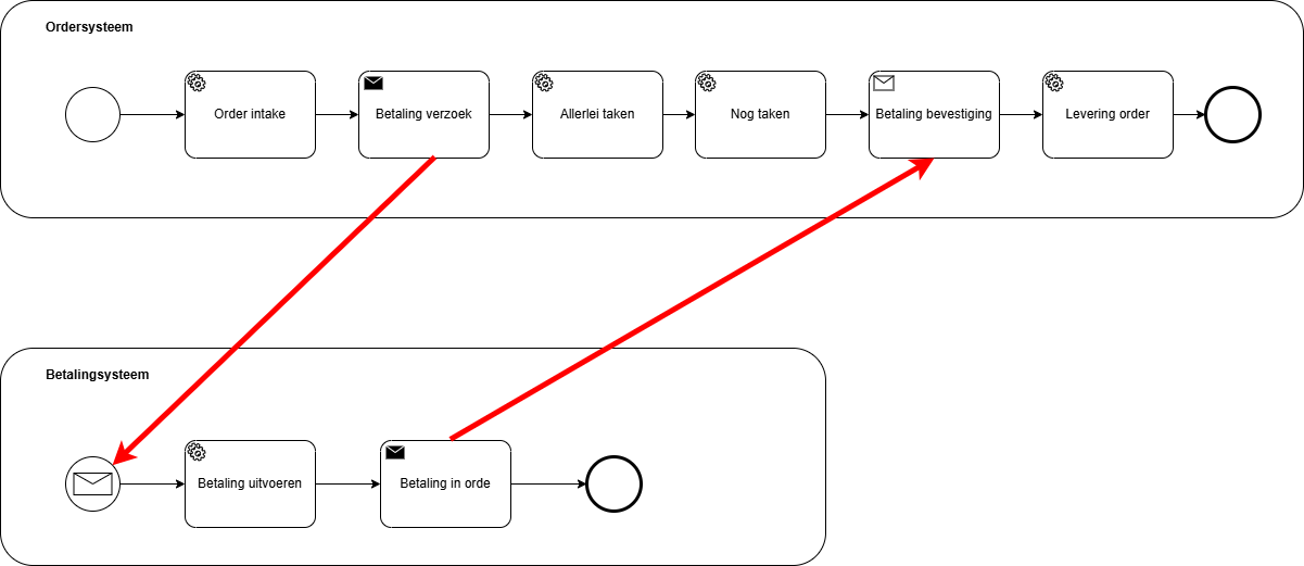 Kleine kanttekening: het betalingssysteem werkt hier ook op basis van een BPMN-workflow, maar dit hoeft niet noodzakelijk zo te zijn. Het kan evengoed een extern systeem zijn dat volledig losstaat van je applicatie en dat op basis van een compleet andere technologie werkt. In dat geval kunnen berichten overgebracht worden door een message broker.