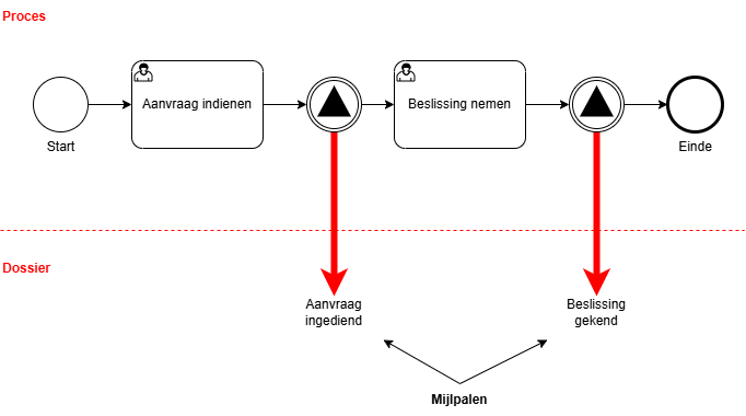 Een tweede voorbeeld is het aanmaken van mijlpalen door middel van intermediate signal throw events. Hiermee kan je de dossierstatus visualiseren zowel binnen de backoffice (in te stellen via de dossiertype overzichtsvelden functionaliteit) als binnen de frontoffice (in te stellen via de dossiertype instellingen).