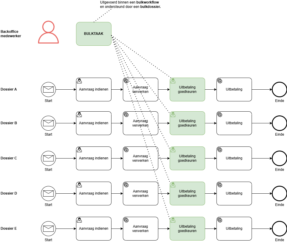 De bulktaak wordt gedefinieerd binnen een aparte bulkworkflow. Wanneer je die opstart, maak je een bulkdossier aan. Dit dossier heeft slechts een tijdelijke levensduur en heeft als enig doel het ondersteunen van de bulkworkflow. Van zodra de flow uitgevoerd is, verliest dit dossier echter zijn nut of betekenis. Het wordt meteen weer verwijderd en is dan ook niet meer zichtbaar in de backoffice dossierlijst.