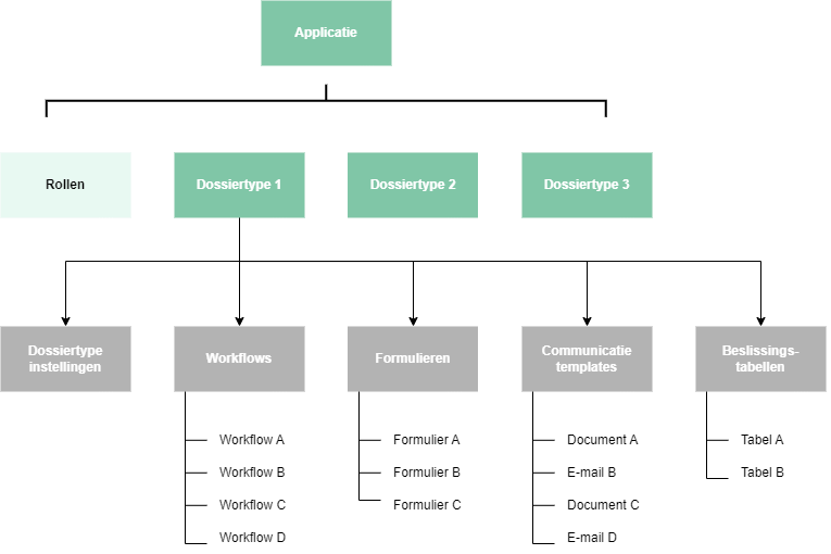 Een dossiertype is een verzameling configuratie-items die een specifieke dienstverlening binnen een applicatie aanstuurt. In het onderstaande voorbeeld bevat de applicatie drie verschillende dossiertypes, die drie verschillende dienstverleningen vertegenwoordigen. Elk dossiertype bestaat uit een aantal configuratie-items (dossiertype instellingen, workflows, formulieren, communicatie templates en beslissingstabellen). Dossiertypes en hun configuratie-items kunnen worden aangemaakt, beheerd en bewerkt via Studio.