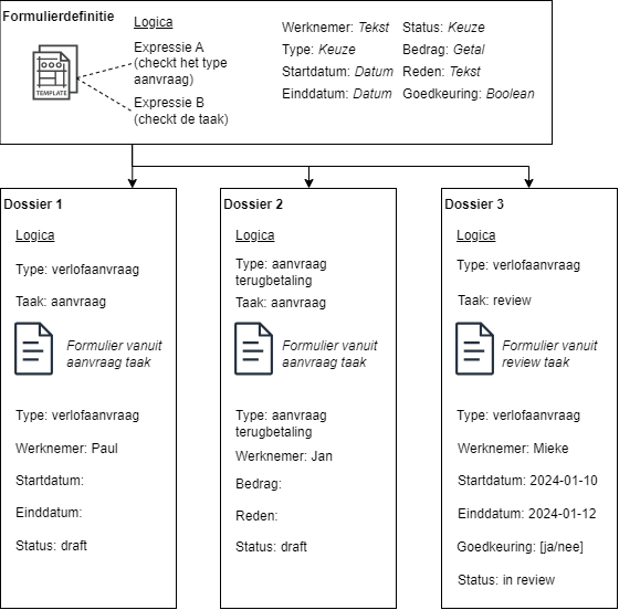 Een formulier is een manier om gestructureerde gegevens vast te leggen. De invoer kan komen van een menselijke gebruiker die het formulier handmatig invult, of van een service die het formulier automatisch invult. Formulieren zijn afgeleid van formulierdefinities die je kan aanmaken en bewerken binnen een dossiertype. Via formulieren geef je flexibel gestalte aan de datastructuur van elk dossier.
