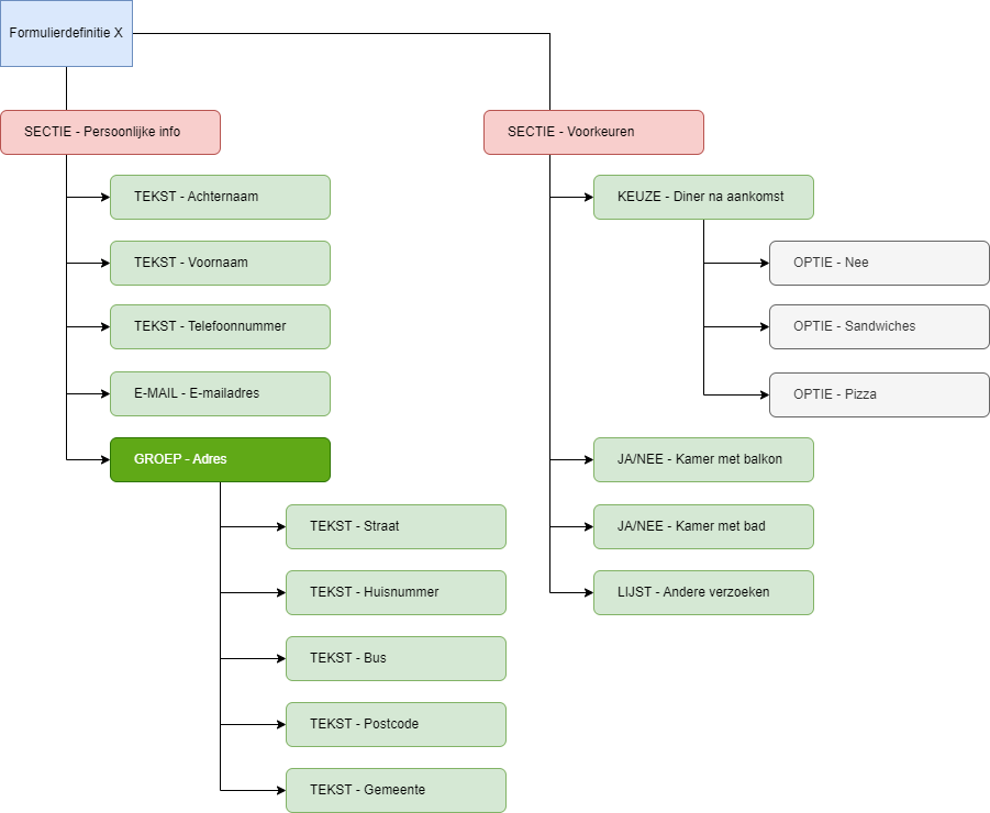 In Studio kun je formulierdefinities configureren aan de hand van elementtypes (formuliervelden) zoals tekst, ja/nee (booleaan), getal, e-mail, secties en/of groepen. Onderstaand schema geeft een voorbeeld van hoe een formulierdefinitie gestructureerd kan zijn.