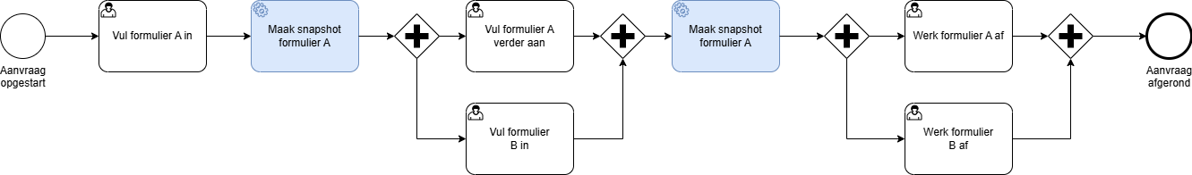 De inhoud van formulieren binnen het proces kan wijzigen doorheen het proces. Denk aan een dossierbehandelaar die specifieke gegevens aanvult of corrigeert. Of denk aan de aanvrager die achteraf een extra item toevoegt aan een lijst. Net omwille van die potentieel dynamische formulierinhoud wil je op specifieke momenten in de flow de toestand van het formulier vastleggen. Zo kan je achteraf bijvoorbeeld nagaan wat de exacte toestand van het formulier op een bepaald moment in de tijd was. Dit kan belangrijk zijn in geval van betwistingen of bijkomende procedures.