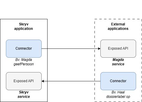 Functioneel en technisch vertoont de exposed API een sterke gelijkenis met de connector in die zin dat beiden een interface tot stand brengen tussen de Skryv applicatie en een externe applicatie. Het verschil is dat bij de connector de interactie start vanuit de workflow in de Skryv applicatie, terwijl bij de exposed API de interactie start vanuit de externe applicatie.