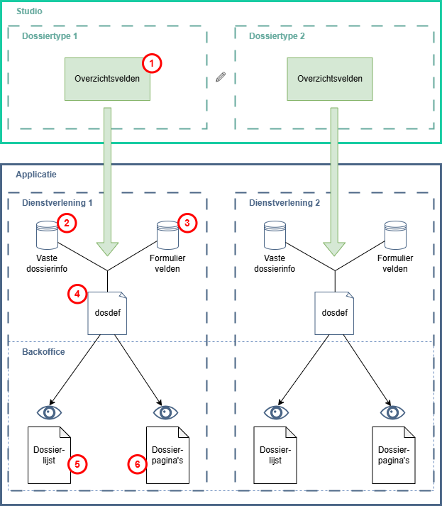 Via overzichtsvelden (ook wel aangeduid als summary fields) (1) kan je als Studio configurator per dossiertype bepalen welke dossierinformatie standaard gevisualiseerd wordt binnen de backoffice. Daarbij gaat het enerzijds om de kolommen in de dossierlijst (5) en anderzijds om de samenvattende info op de individuele dossierpagina’s (6). De overzichtsvelden kunnen putten uit vaste dossierinfo (2) (bijvoorbeeld dossierlabel, aanmaakdatum dossier, laatst behaalde mijlpaal, enzovoort) en uit alle mogelijke formuliervelden (3). De overzichtsvelden zitten geconfigureerd binnen de dossiertype instellingen (4), ook wel dosdef genaamd.