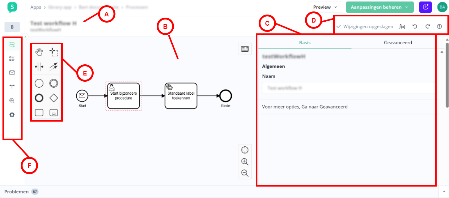 A | Titel workflow | Naam en key van de workflow die je aan het bewerken bent. |