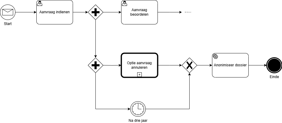 Na indienen van de aanvraag gaat de workflow verder en is een dossierbeheerder aan zet om de aanvraag te beoordelen. Tegelijk worden twee zijvertakkingen geactiveerd. Zo krijgt de aanvrager de optionele actie om de aanvraag te annuleren, en is er ook een timer die begint af te tellen. Na exact drie jaar gaat de process token verder en worden de dossiers onherroepelijk geanonimiseerd.