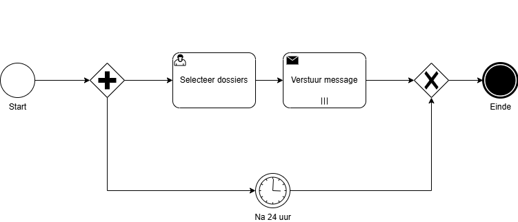 Via de parameter “canBeDeactivatedWhenReady”:true wordt een dossier van het bulkdossiertype automatisch afgesloten en verwijderd uit het backoffice dossieroverzicht van zodra de workflow zijn end event bereikt (d.w.z. na uitvoeren van selectie- en verzendtaak). In de praktijk blijkt dat backoffice medewerkers vaak een bulkdossier opstarten, de selectielijst bekijken, maar dan uiteindelijk cancellen. Dit zorgt ervoor dat het bulkdossier blijft leven en dus het dossieroverzicht vervuilt. Om dit te verhinderen, kan je de bulkworkflow licht anders configureren zodat een aangemaakt dossier sowieso verwijderd wordt na een bepaald tijdsverloop.