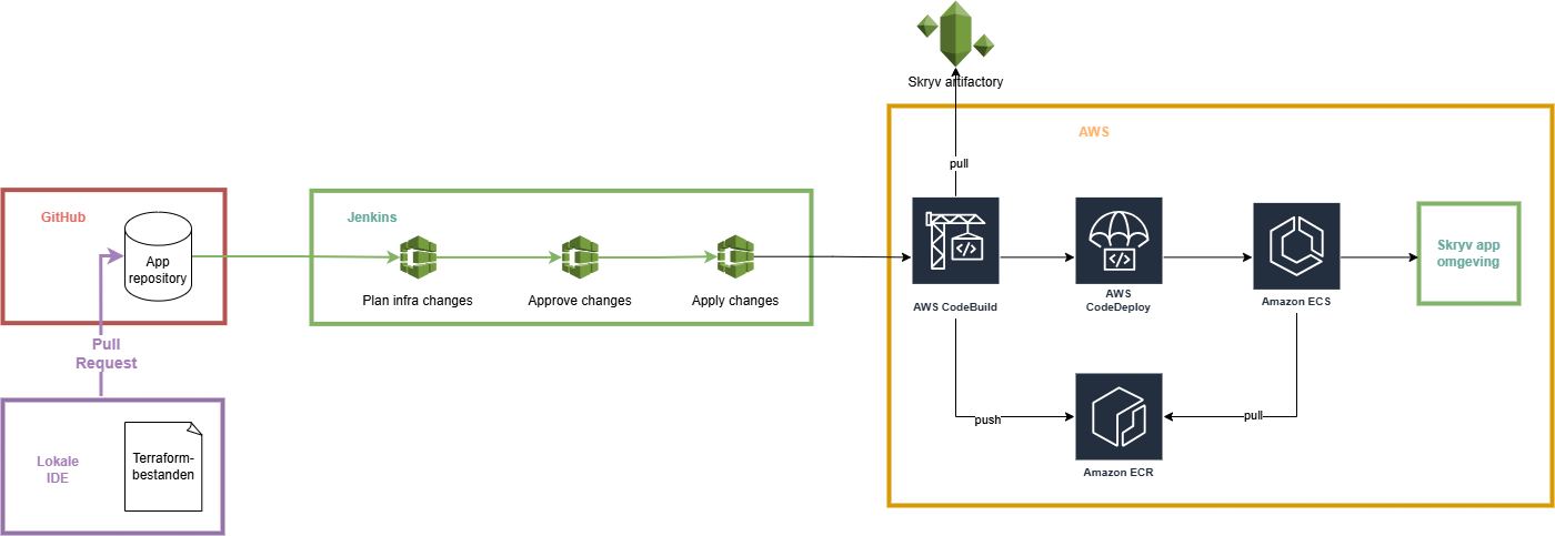De uiteindelijke Terraform‑configuraties worden door een CI/CD‑tool, zoals Jenkins, uitgevoerd. Na expliciete goedkeuring (code‑review en goedgekeurd plan) voert de pipeline de benodigde terraform apply‑stappen uit, zodat de gewenste AWS‑resources automatisch worden ingericht op basis van de bronconfiguratie in git. Tijdens de build‑ en deployfase van de applicatie worden op basis van de Maven‑dependencies (gedefinieerd in pom.xml) de vereiste libraries opgehaald uit de Skryv‑Artifactory.