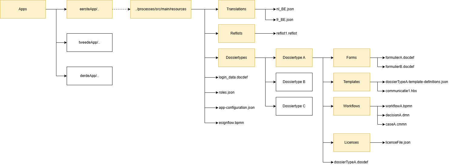 Hieronder zie je een schetsmatige voorstelling van de configuratie-items structuur. De meeste van deze configuratie-items of artefacts kan je aanmaken en bewerken via Studio. Voor developers die op hun pc een lokale app willen opzetten, is het belangrijk om deze structuur te handhaven.
