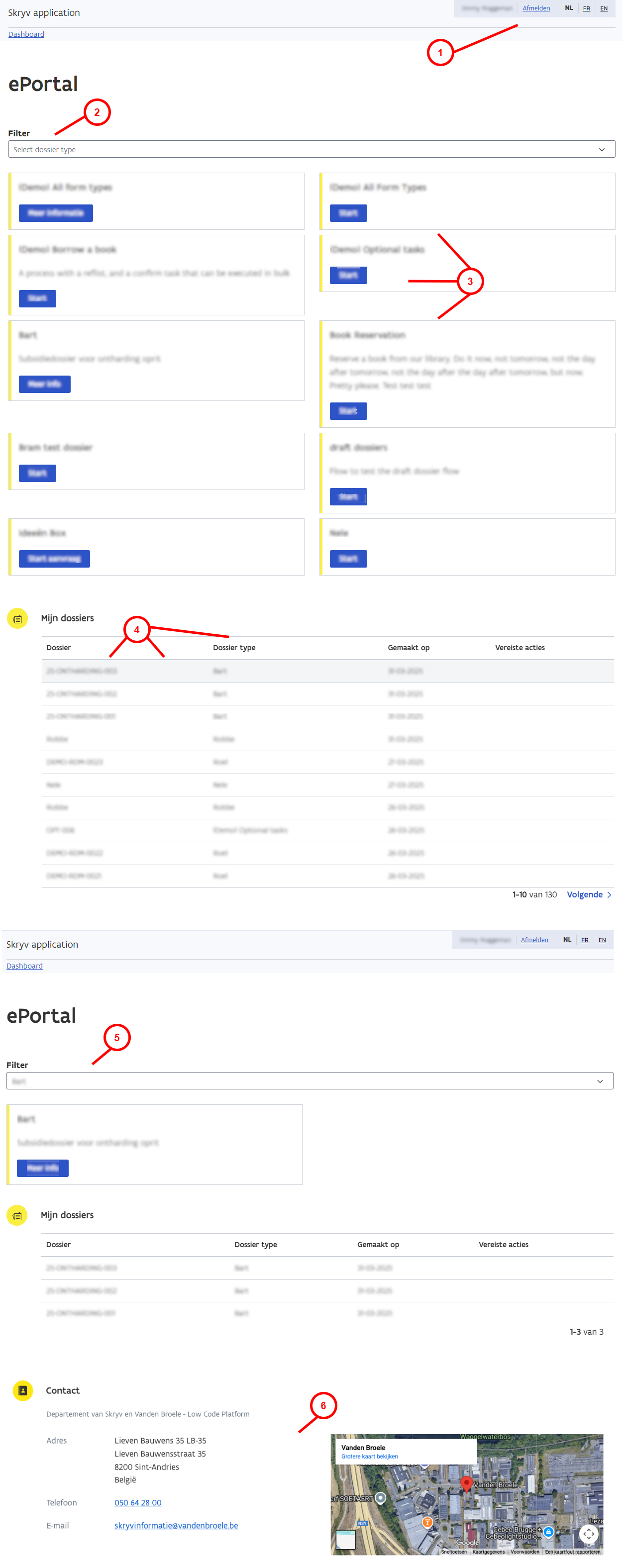 Het dashboard is de startpagina voor frontoffice gebruikers. Hier kan een gebruiker een nieuw dossier opstarten of doorklikken naar eerder opgestarte dossiers. Indien er veel dossiertypes en/of veel opgestarte dossiers zijn, kan het overzicht wat zoek raken. In dat geval kan de gebruiker via een dropdown multiselect filter één of meerdere dossiertypes selecteren. Dit controleert zowel het overzicht van opstartbare dossiertypes (tegels) als de lijst met reeds opgestarte dossiers.