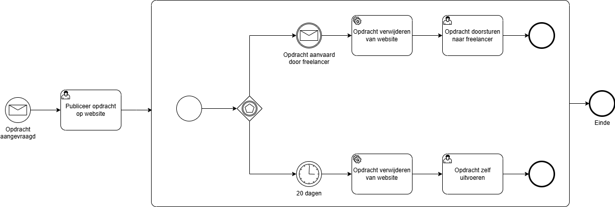 De workflow hieronder maakt gebruik van een event based gateway. De process token wacht in de gateway tot één van beide uitgaande flows getriggerd wordt door een intermediate catch event. In het voorbeelddiagram zie je twee typische intermediate catch events, namelijk een timer (na 20 dagen) en een inkomend message (een freelancer reageert op een gepubliceerde opracht). De process token gaat enkel door in de geactiveerde flow. De andere flow wordt verder genegeerd.
