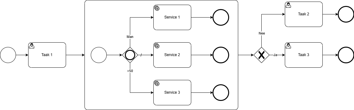 In de workflow hieronder zorgt de eerste gateway ervoor dat de workflow vertakt. Op deze manier kunnen twee verschillende voortzettingen worden gemodelleerd. Omgekeerd voegt de tweede gateway de twee flows weer samen tot één vervolg. Hier zijn exclusive gateways gebruikt: slechts één van beide paden kan worden geactiveerd.