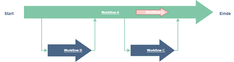 Workflow A vertegenwoordigt het hoofdproces. Workflow B en workflow C zijn called workfows. Workflow D is een subworkflow (subproces).